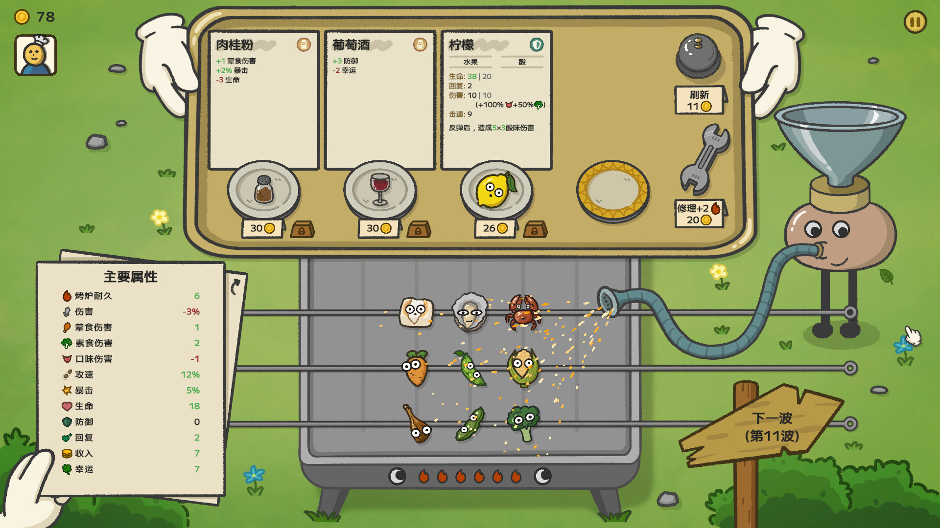 《别拽了!烤串师傅》是一款可爱又混乱的塔防Roguelike游戏。在游戏中化身烤串大师,随机抽食材、拼调料,凑出一支好吃又能打的串串小队,保卫你的烤炉!